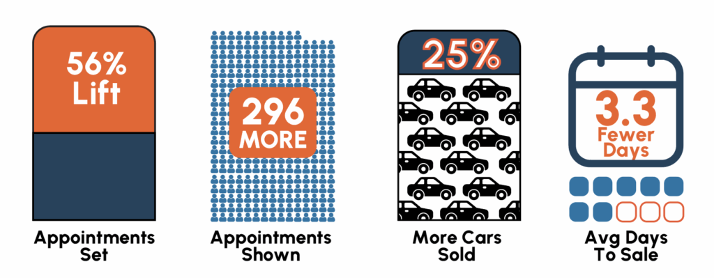 Q: What’s a good appointment show rate? Getting 296 more people to actually show up (like these dealers did) is significant. Most dealers struggle with 30-50% show rates.