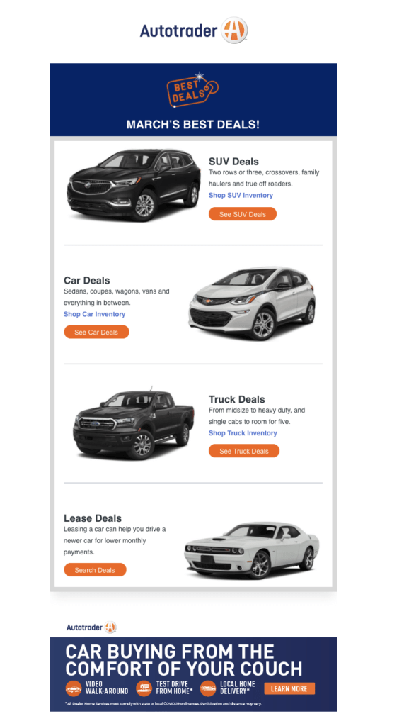 The first email was from Kelley Blue Book, owned by Cox Automotive. The email promoted “The Best Vehicle Deals for March”, and encouraged me to trade in my car with an instant cash offer.