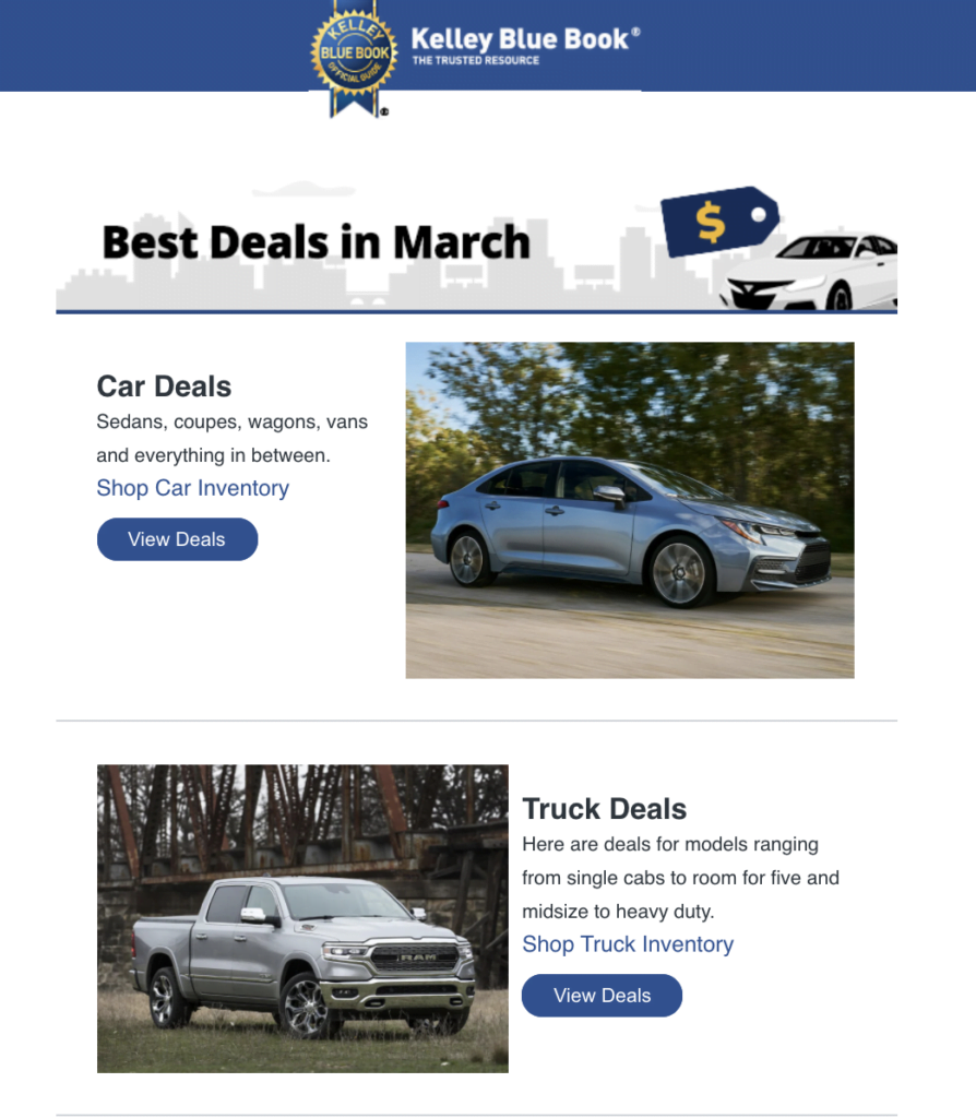 The first email was from Kelley Blue Book, owned by Cox Automotive. The email promoted “The Best Vehicle Deals for March”, and encouraged me to trade in my car with an instant cash offer.