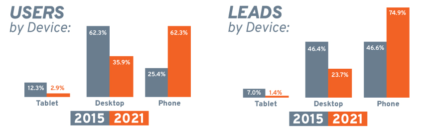 In 2015, 44% of trade-in leads were from mobile. In 2021, 75% of their trade in leads came from phones. Tablet usage also fell off a cliff between 2015 and 2021.