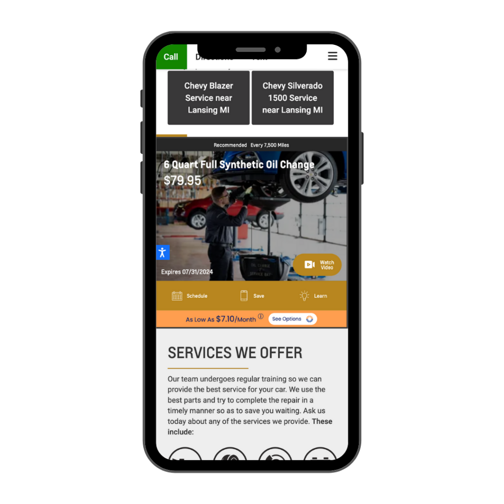 Feldman Chevrolet of Lansing’s service page was visually appealing and mobile-friendly, allowing users to quickly navigate, view scrolling popular offers, schedule services, save details to their phone’s wallet, or learn more about each offer.