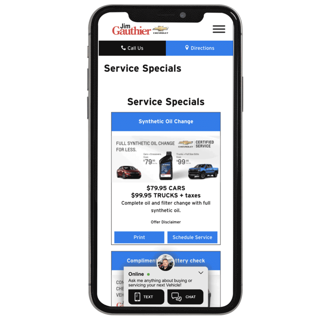The last example from Feldman Chevrolet of Lansing gets it right. Notice how visually appealing the page is on mobile. As a user I can navigate quickly to exactly what I want to do. As I browse the service specials, the most common and popular offers scroll through, I can quickly schedule it, save it to my phone’s wallet, or learn more about it.