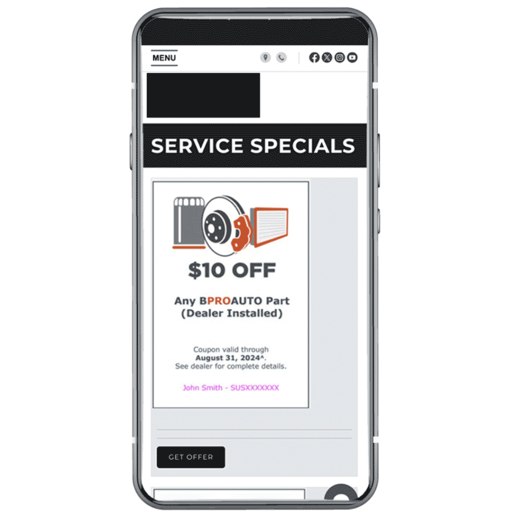 In the first example in the video, the first offer you see is for $10 off any BPROAUTO Part…what the heck is that, why are you leading with that as the most important offer, why do I have to visit the dealership for all the details instead of just getting them on the site, and what’s all that pink John Smith text about?